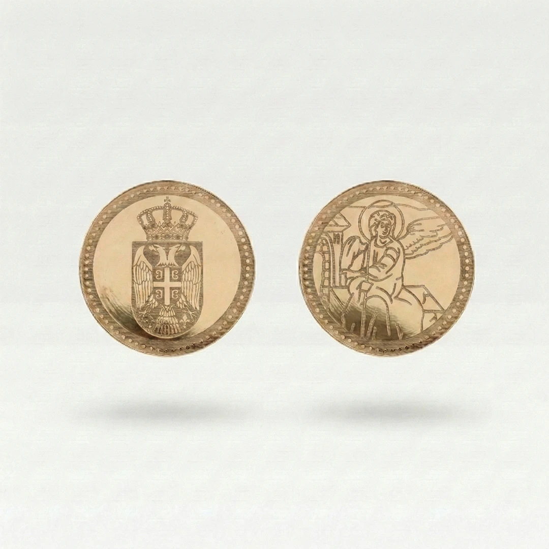 Dukat je napravljen od zlata 585 prečnika približno 18mm, uz dukat dobijate sertifikat o čistoći i kvalitetu zlatnog nakita. Mogućnost graviranja po želji. Težina oko 1.1gr.